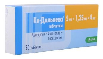 Найти препарат в аптеках Торговое название препарата: Ко-Дальнева (Co-Dalneva) Международное непатентованное наименование: Амлодипин + Индапамид + Периндоприл (Amlodipine + Indapamide + Perindopril) Лекарственная форма: таблетки…