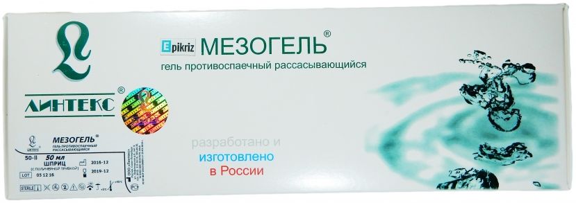 Мезогель- гель противоспаечный рассасывающийся, стерильный — применяют во время операций, которые сопровождаются повреждением или высушиванием покровов органов и тканей, особенно при операциях по поводу спаечной болезни. Гель действует как искусственный временный «барьер» между поврежденными поверхностями, обеспечивая эффективное разделение поверхностей на время их заживления. По окончании действия гель полностью выводится из организма. Срок рассасывания — 3-5 дней. Уменьшение слипания поверхностей органов и тканей способствует сохранению их подвижности и препятствует образованию спаек. При нанесении на здоровые участки тканей гель способствует уменьшению их высушивания за счет образования защитного гидрофильного слоя (при эвентрации кишечника, внутренних органов и т.п.).