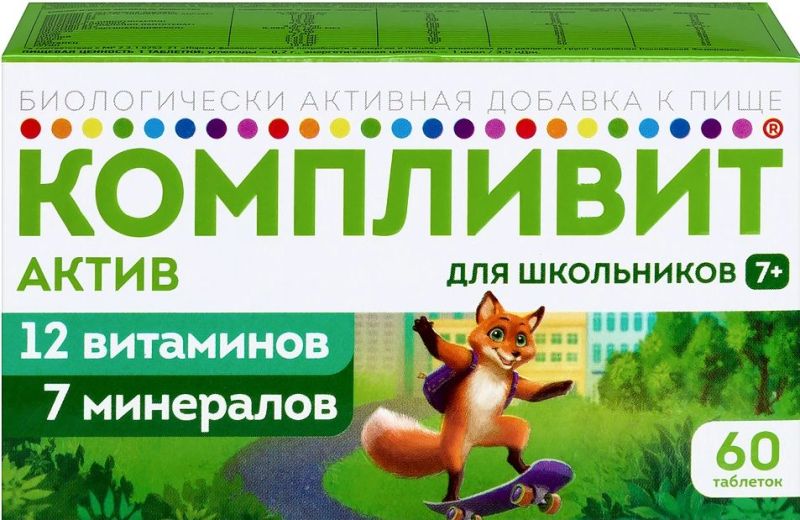 Биологически активная добавка к пище Компливит Актив является дополнительным источником витаминов A, С, Е, D (в 1 таблетке 200 МЕ), группы В (В1, В2, В3, В5, В6, В12, фолиевой кислоты), минеральных элементов (железа, меди, цинка, селена, йода, марганца), содержащей магний.