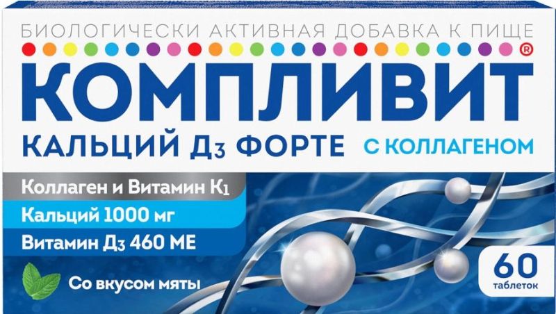 Биологически активная добавка к пище «Компливит Кальций Д3 форте с коллагеном» рекомендуется в качестве дополнительного источника кальция, витаминов D3 (460 МЕ) и K1.