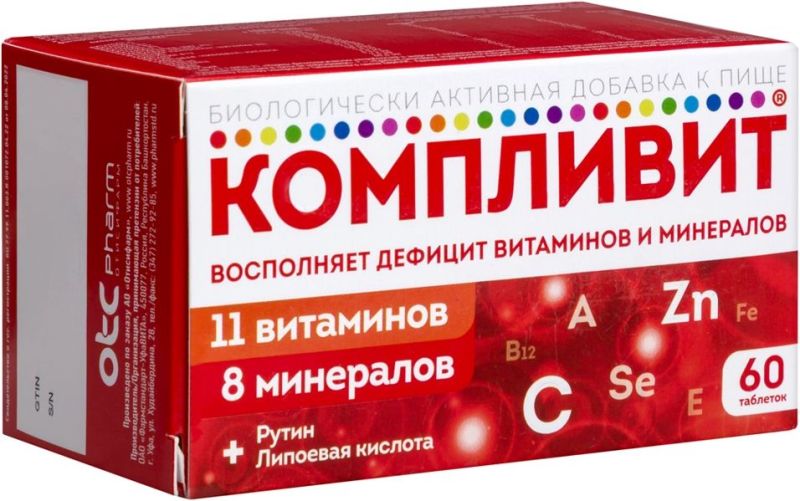 Биологически активная добавка к пище Компливит является дополнительным источником витаминов A, E, C, группы B (B1, B2, B3, B5, B6, B12, фолиевой кислоты, биотина), минеральных элементов (железа, марганца, меди, цинка, магния, селена), источником рутина и липоевой кислоты.