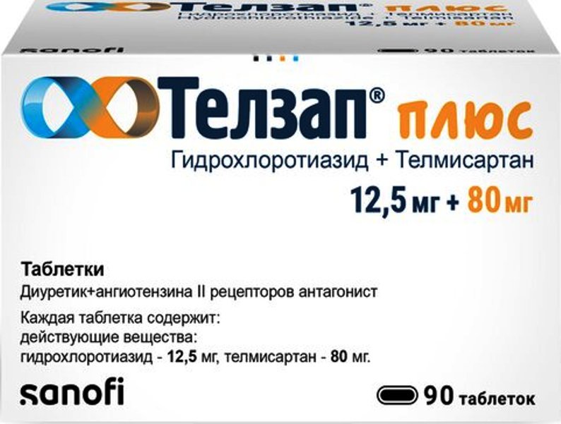 Препарат Телзап Плюс представляет собой комбинацию телмисартана (антагониста рецепторов ангиотензина II (АРА II)) и гидрохлоротиазида (тиазидного диуретика). Сочетание данных компонентов обеспечивает более выраженное антигипертензивное действие, при этом уровень артериального давления (АД) снижается сильнее, чем на фоне монотерапии данными компонентами.