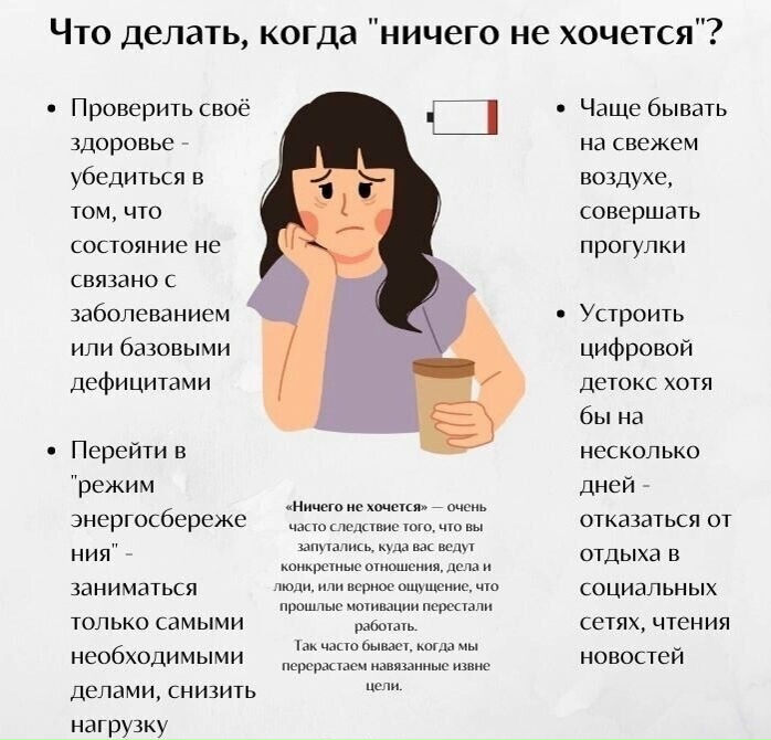 Если ничего не хочется, важно не ругать себя, а дать организму отдых, наладить режим сна и питания, а также попробовать маленькие физические нагрузки (прогулки, разминка), чтобы вернуть энергию. При длительной апатии (более 2-х недель) необходимо обратиться к специалисту (психологу или психотерапевту), так как это может быть симптомом выгорания или депрессии.