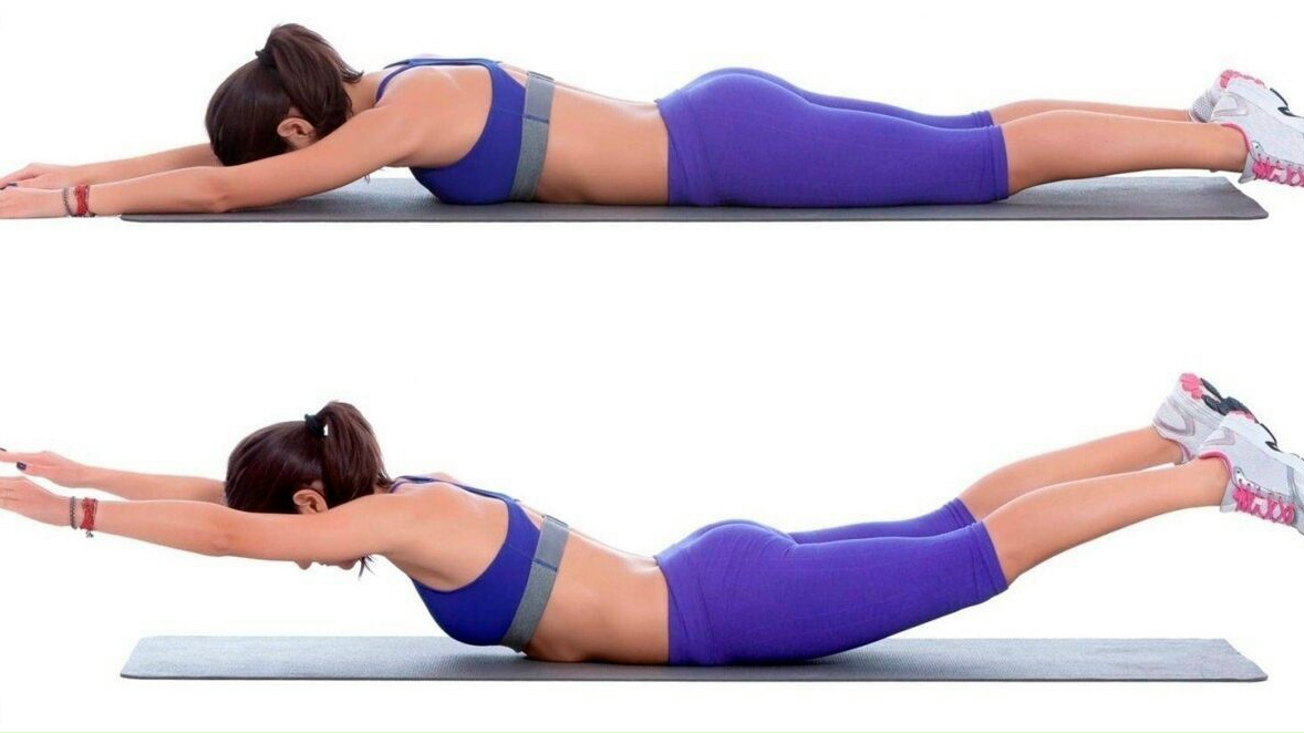 Медленно опускаетесь в исходное положение. Повторите разгибание спины, лежа на животе, 10 раз.