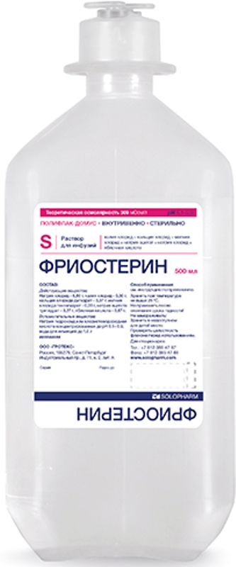 Фриостерин является изотоническим раствором электролитов с концентрацией электролитов, адаптированной к концентрации электролитов плазмы крови. Применяется для коррекции потери внеклеточной жидкости (т.е. потери воды и электролитов в соразмерных количествах). Введение раствора направлено на восстановление и поддержание осмотического статуса во внеклеточном и внутриклеточном пространстве.