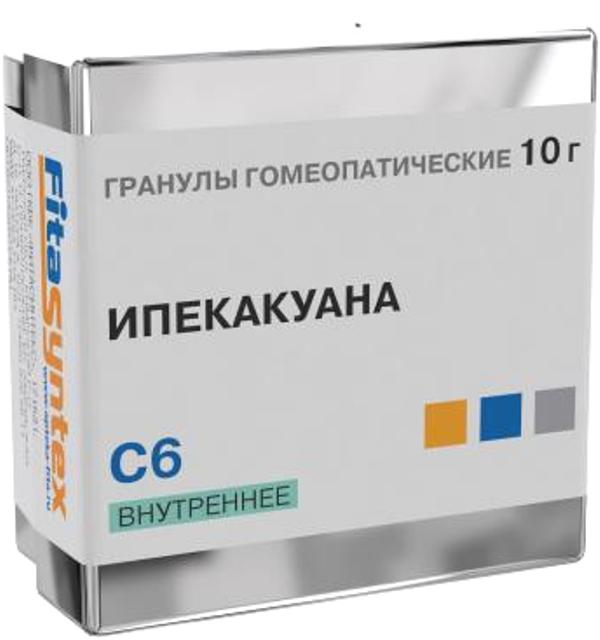 Монокомпонентный гомеопатический препарат, действие которого обусловлено его компонентом. Ипекакуану (Рвотный корень) выпускают в виде гомеопатических гранул C1000, C12, C200, C30, C50, C6, D6. Средство растительного происхождения. В корнях ипекакуаны содержится большое количество алкалоидов (в т.ч. эметин, цефаэлин, аметамин, протоэиетин, психотрин), гликозид ипекакуанин, а также сапонины, фитостерин, холин, яблочная и лимонная кислоты. Оказывает отхаркивающее действие, которое обусловлено способностью рефлекторно усиливать секреторную функцию бронхиальных желез и разжижать мокроту, повышать активность ворсинок мерцательного эпителия дыхательных путей; в больших дозах вызывает раздражение слизистой оболочки желудка, что приводит к развитию рвоты с длительным предшествующим периодом тошноты.