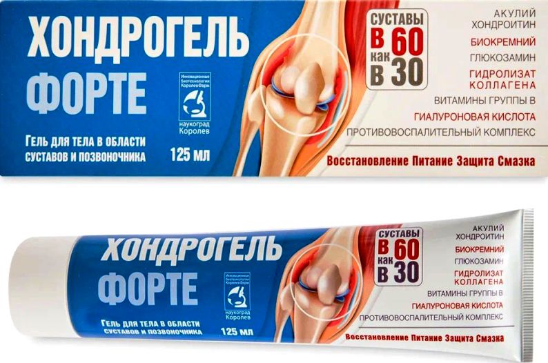 Эффективное средство, разработанное совместно «Королёвфарм» и НПО «Космическая реабилитационная медицина» специально для предотвращения преждевременных и возрастных дегенеративно дистрофических процессов, а также для активного обновления. Способствует нормализации функционального состояния и увеличения гибкости. Содержит основные структурные компоненты хряща и синовиальной жидкости в биодоступной форме. Улучшает обменные процессы в тканях, стимулирует регенерацию, способствует укреплению связочного аппарата. Действие и эффективность геля для тела Хондрогель Форте обеспечены высокой биологической активностью и синергизмом его компонентов. Акулий хрящ – превосходный биодоступный источник незаменимого хондроитина. Хондроитин – основной структурный компонент хряща и естественный защитник (хондропротектор) его клеток. Повышает влагоемкость хряща, предотвращает его высыхание. Замедляет резорбцию (разрушение) костной ткани, улучшает фосфорно-кальциевый обмен в хрящевой ткани, стимулирует восстановление изношенных суставных тканей, улучшает качество суставной смазки. Глюкозамин – неотъемлемый элемент хрящевой ткани. Обеспечивает выработку хондроитина, улучшает обменные процессы в суставах. Стимулирует производство глюкозаминоглюканов, необходимых для восстановления хряща. Способствует регенерации поврежденного хряща при воспалительных и деструктивных процессах. Снижает болевые ощущения.