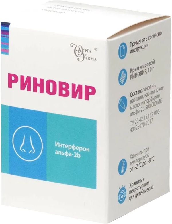 Биологически активное вещество интерферон альфа-2b особенно эффективно на ранних стадиях простудных заболеваний (ОРВИ, грипп) и герпеса. Предотвращает развитие простудных заболеваний и герпеса. Крем изготовлен на основе гипоаллергенных компонентов. Защищает от вредного воздействия внешней среды, предотвращает сухость и воспаление слизистых и кожи. Крем Риновир используется для смягчения, увлажнения кожи и слизистых оболочек (носа, губ), вследствие чего активируется природная способность организма защищаться от инфекций и вредных факторов.