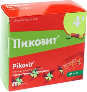 Поливитамины с макроэлементами. Пиковит содержит 10 наиболее важных витаминов, а также кальций и фосфор. Витамины группы B (B1, B2, B6, B12, пантотеновая кислота и никотинамид) участвуют в метаболизме углеводов, белков и жиров. Фолиевая кислота (витамин B9) неактивна, однако в организме она превращается в биологически активный кофермент - тетрагидрофолиевую кислоту, который необходим для биосинтеза нуклеиновых кислот. Он усиливает рост и участвует в созревании эритроцитов. Фолиевая кислота участвует в образовании и регенерации тромбоцитов и их функции. Ретинол (витамин А) необходим для развития эпителиальных клеток и синтеза зрительного пигмента. Колекальциферол (витамин D) участвует в обмене кальция и способствует правильной минерализации костей и зубов. Аскорбиновая кислота (витамин С) ускоряет абсорбцию железа и принимает участие во многих окислительно-восстановительных процессах в организме. Кальций и фосфор играют ключевую роль в минерализации костей и зубов. Ионы кальция активизируют многочисленные ферменты, они принимают участие в регулировании тонуса сердечной мышцы, в передаче нервных импульсов и регулируют проницаемость мембран клеток. Водорастворимые витамины (витамины группы B, витамин C и биотин) хорошо абсорбируются в количествах, соответствующих суточным потребностям организма. Количества, превышающие уровень насыщения тканей, выводятся почками и, в меньшей степени, через ЖКТ. После приема внутрь жирорастворимые витамины A и D хорошо абсорбируются из тонкой кишки в присутствии жиров. Более высокие количества жирорастворимых витаминов накапливаются в печени и, поэтому, являются более токсичными, чем водорастворимые витамины.